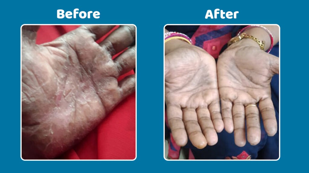 Patches on Skin Whitish scales on Patches Cracked Dry Skin Itching sensation near patches Nails thick and scarred.